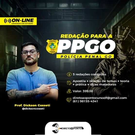 Aqui, cada aluno recebe correção individualizada, um diferencial que garante o seu progresso constante. Nossas aulas são dinâmicas e envolventes, de forma a tornar o aprendizado mais eficaz e prazeroso. Adicionalmente, os temas são cuidadosamente elaborados para o concurso de PPGO, com base no estudo da Lei de Execução Penal. E não se preocupe em tirar dúvidas - nosso professor está sempre disponível para te ajudar. Com uma didática incomparável, o Professor Dickson Cosseti é reconhecido como um dos melhores do Brasil em redação. Com mais de 15 anos de experiência e com milhares de alunos aprovados, ele é uma das maiores referências em Redação para carreiras policiais. Uma nova vida te aguarda, vem com a gente rumo à PPGO!